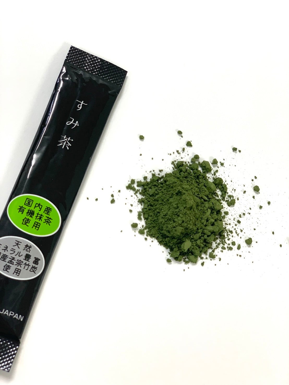 国産有機茶葉の新茶の一番茶と孟宗竹炭を絶妙にブレンドしたすみ茶は、デトックス効果が期待できるお茶です。毎日の健康維持に最適です。孟宗竹炭を10%配合しており、安心安全にの一杯です。スティック状の粉茶ですので、ペットボトルのお水にさっと溶け、アイスでもホットでもお飲みいただけます。